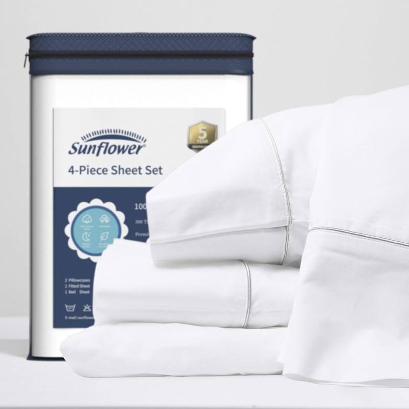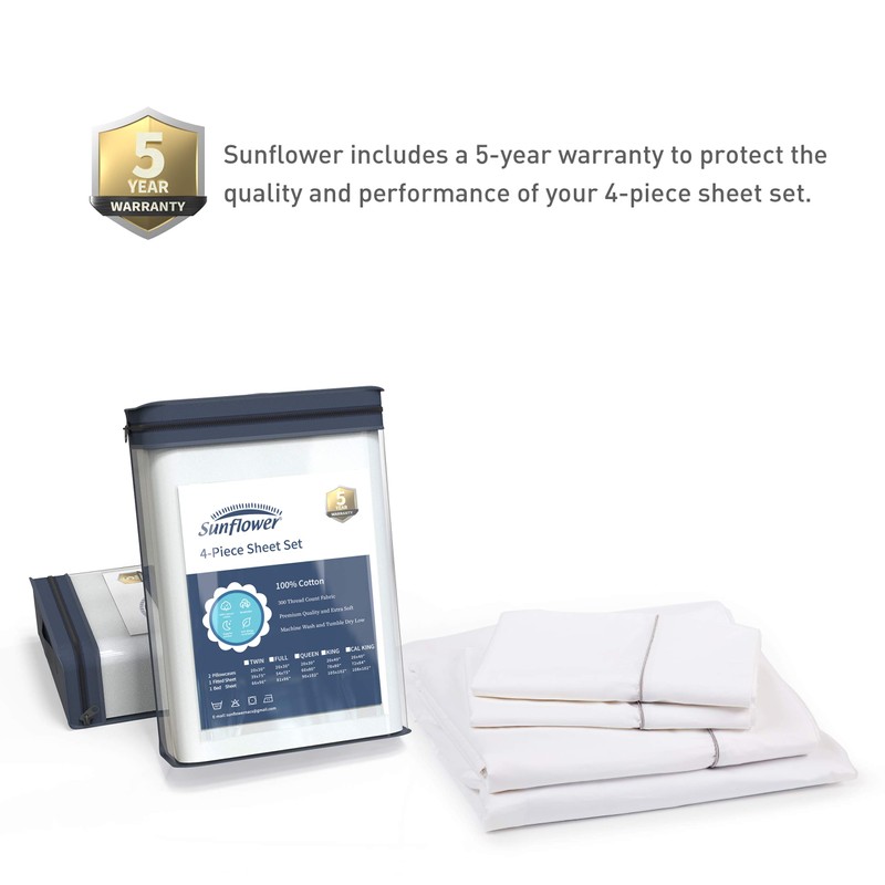 Sunflower 100% Cotton Sheet Set Queen, 22" Extra Deep Pocket 4-Piece Sheet Set, 300TC Flat Sheet Fitted Sheet, Ultra Soft & Hypoallergenic, White
