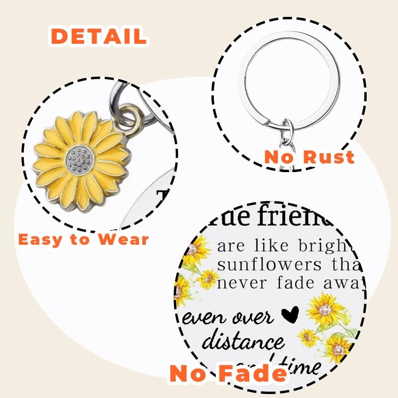 - Quality of Sunflower Friendship Key Chain: This best friend key chain is made of stainless steel, which is very sturdy, not easy to fade or deform, no rusting, clear engraving and can be used for a long time, the ture friends sunflower key ring can be used as close best friend birthday christmas present for friends bestie women, moving going away gift for friend bestie