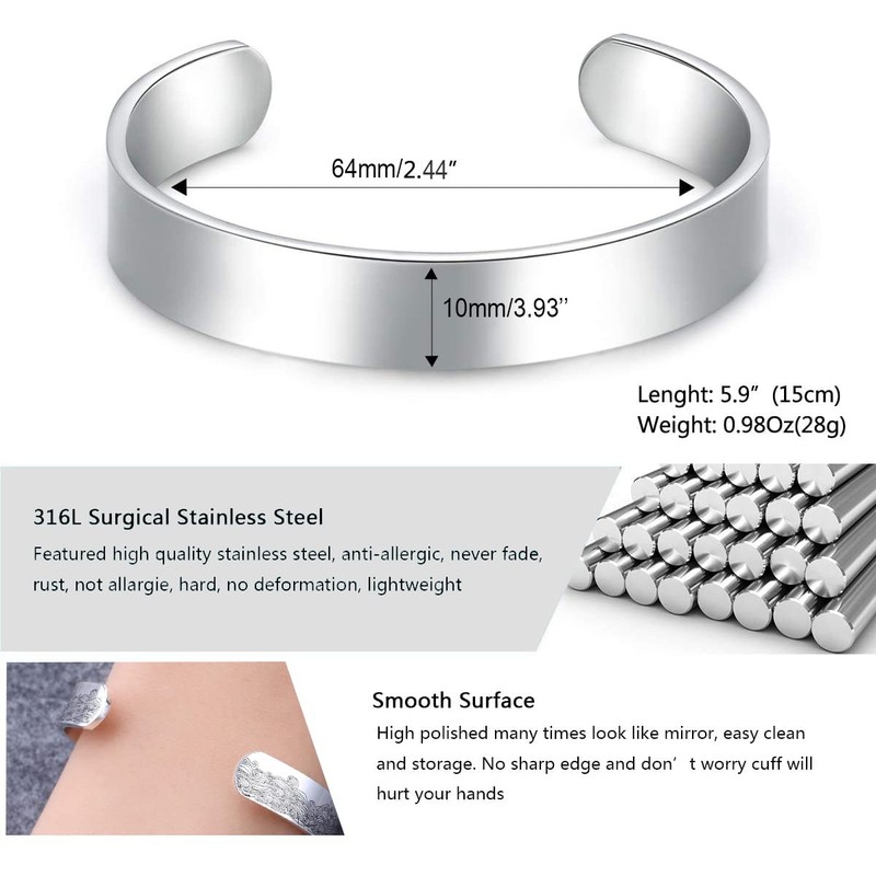 - Affordable Price with exquisite quality, High polished cuff bracelet, shinne surface, very smooth with rounded edges to avoid scratch your wrist, clear engraved easily reading