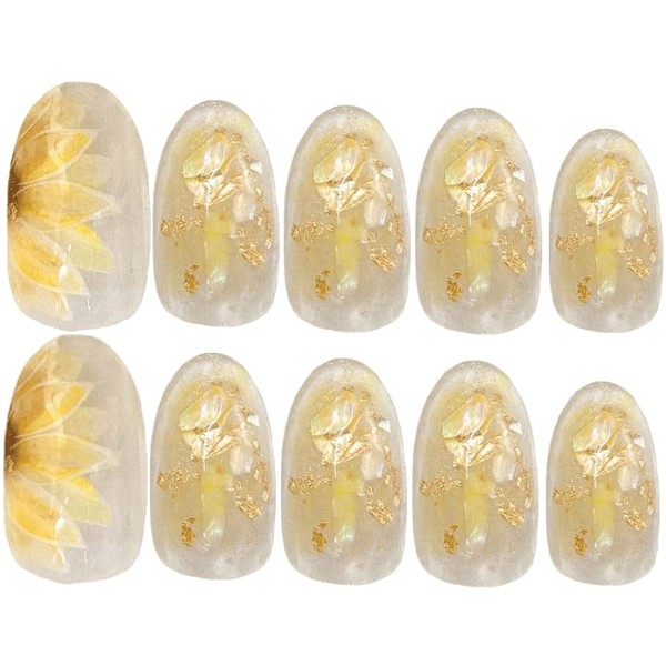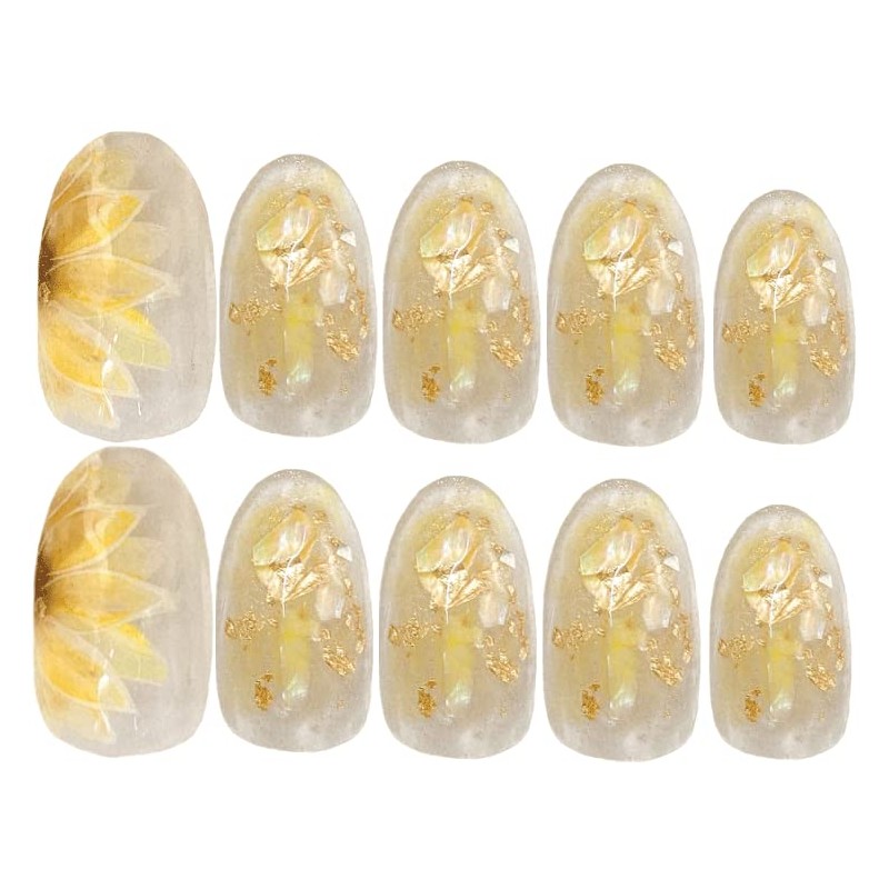In addition, 8 nail tips except for the sunflower flower nail art on the thumb part are also sunflower yellow. The false nail has a clear base that gives a mature impression. A rare yellow shell part in the nail tip industry, embedded with glittering gold foil, this yellow nail tip has a gorgeous rich image.