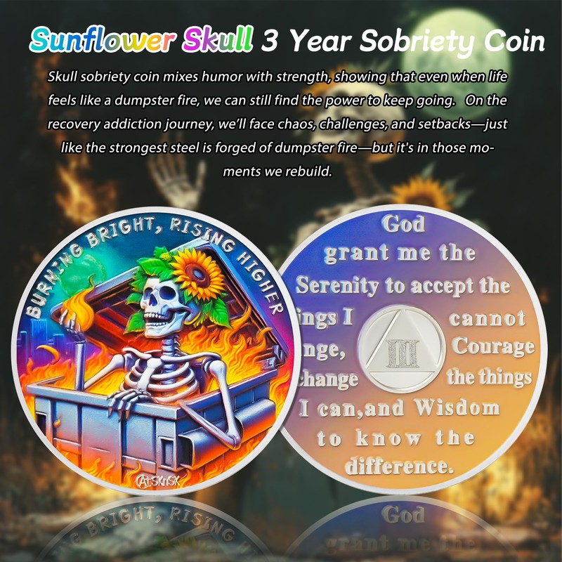 Sunflower Skull 3 Year Sobriety Coin - Dumpster Fire Three Year AA Coins - Recovery Addiction NA AA Chips and Medallions - 1-10 Prime Celebrate Clean Narcotics Alcoholics Anonymous Gifts for Men Women