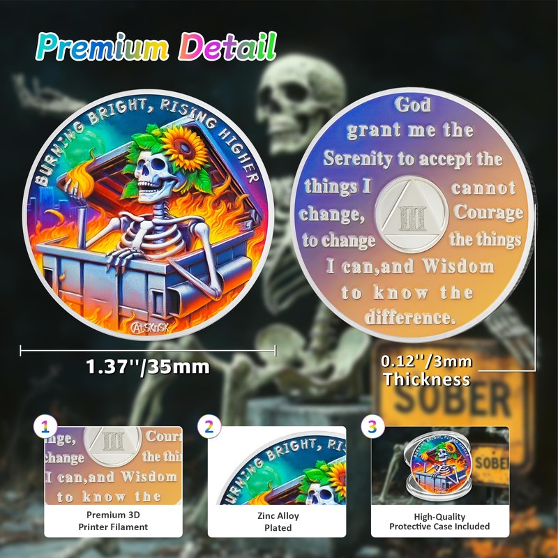 - 💀Dumpster Fire Sober: This original skull sobriety coin mixes humor with strength, showing that even when life feels like a dumpster fire, we can still find the power to keep going. On the recovery addiction journey, we’ll face chaos, challenges, and setbacks—just like the strongest steel is forged of dumpster fire—but it's in those moments we rebuild. AA coins remind us to stay strong, keep a chill attitude, and embrace the process of self-redemption and sobriety