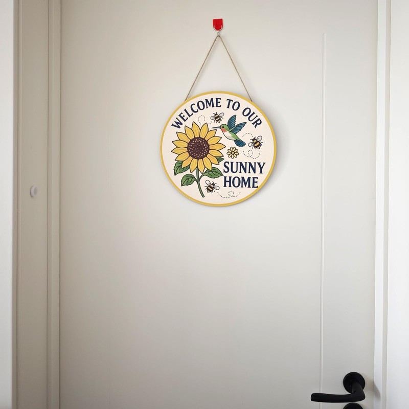 - Charming Sunflower & Nature Design:Brighten up your entryway with this beautifully crafted sunflower door sign, featuring a vibrant sunflower, hummingbird, and bee. The cheerful “Welcome to Our Sunny Home” message adds warmth and charm to any home.