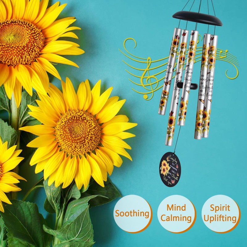 - Gorgeous Sunshine Design - Our sunflower wind chimes for outside feature the premium aluminum tubes adorned with vibrant sunflower patterns and uplifting messages "Be Sunny," "Be Positive," "Be Kind," making it a perfect addition to any outdoor space.