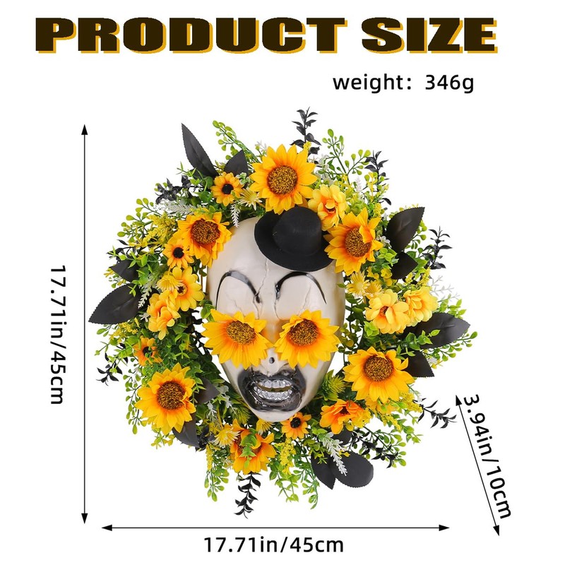 - 【Design】This summer door wreath is covered with yellow sunflowers, green eucalyptus leaves, other wildflowers, etc., with a scary clown face in the middle, and the killer clown's eyes are covered with florals