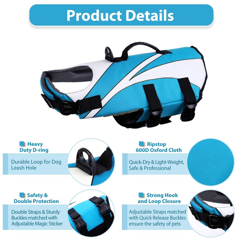 - 【Superior Buoyancy & Ripstop Material】SUNFURA dog life jacket gives your dog additional safety and endurance in the water, which enable strong flotation when swimming without restricting your dog's movement. The dog swimsuit for boating is made of high grade polyester oxford nylon and mesh fabric. Accordingly, the dog life vest not only ripstop but also allow for quick drying and proper drainage.