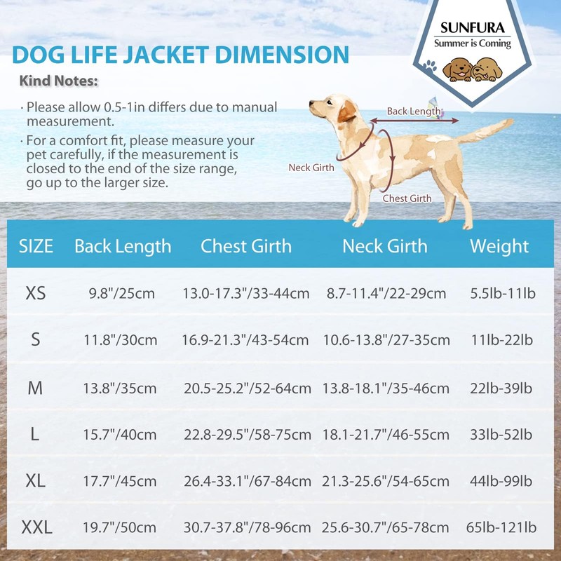 - 【Suitable for Small Medium Large Dogs】The dog life jackets are available in 6 sizes, from XS to 2XL, and meet most breeds of dogs. Please measure your dog twice to get one size and refer to the dimension chart to choose the right size for your dog. If your dog is between two sizes, we suggest the larger one for more comfort. Perfect for dogs with owners who love water sports!