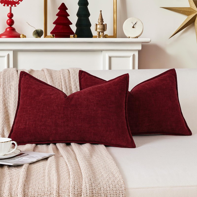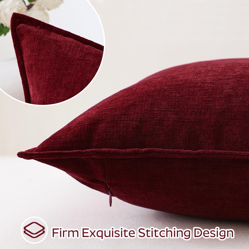 Sungeek Set of 2 Soft Chenille Cushion Covers 30x50cm Lumbar Decorative Throw Pillow Covers with Stitched Edge Solid Dyed Pillow Cases Covers for Home Decor Couch Sofa Bed Living Room, Dark Red