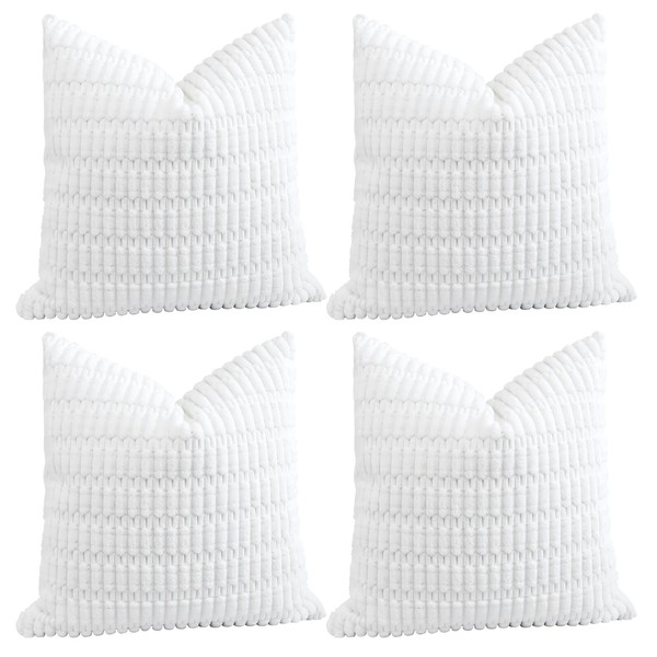 Sungeek Set of 4 Soft Corduroy Decorative Cushion Covers 45x45cm Square Striped Throw Pillow Covers 18x18 Inch for Sofa Couch Living Room Patio Farmhouse Boho Home Decor Pillowcases (White)