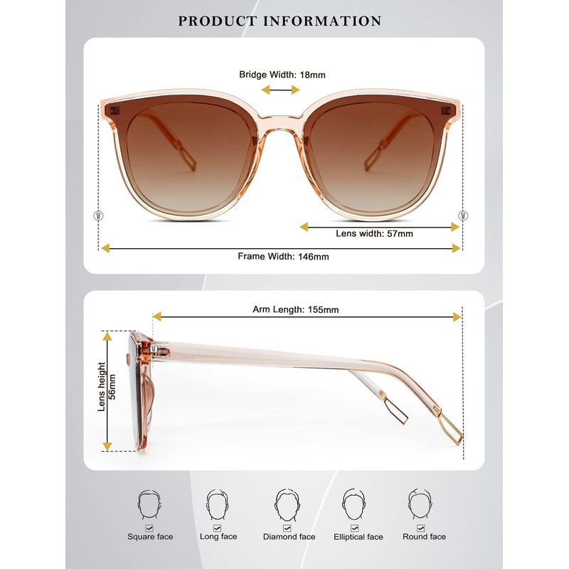 - 💐 Excellent Choice 📢 These lightweight, comfortable, attractive, modern and stylish sunglasses women provide everything you want in trendy sunglasses. They are always your finest choices, whether as a gift or for everyday usage, for driving or outdoor activities.