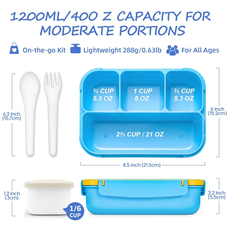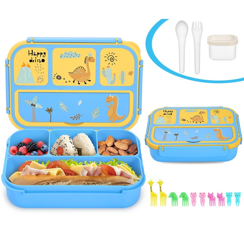 Sunhanny - Lonchera para niños, caja de almuerzo Bento para niñas y niños, con 4 compartimentos, contenedor de salsa, utensilios, púas de comida y magdalenas, dinosaurio azul