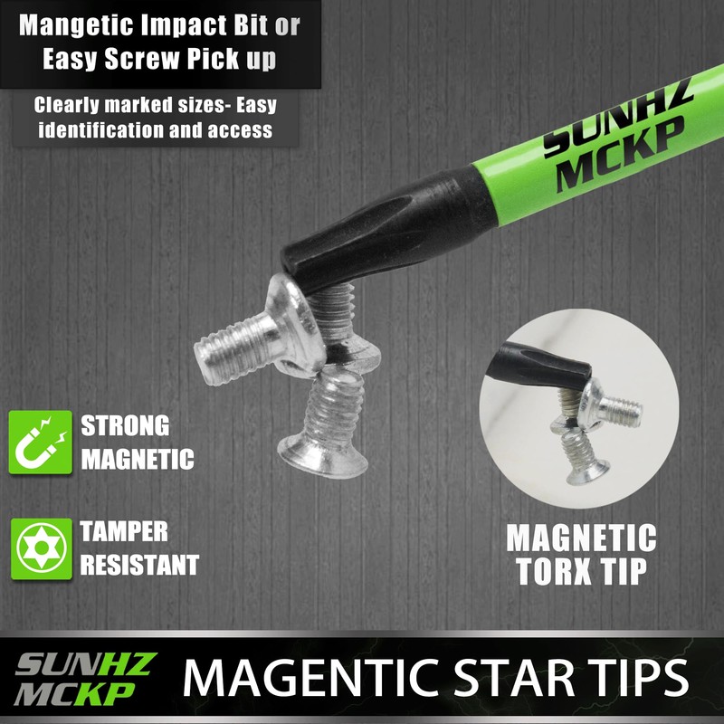 - S2 MATERIAL FORGING: Impact drive bits made of S2 high quality steel material, it owns the features of high hardness and good toughness and resistance through strictly heat treatment, durable, Strong magnetic star tips can easy to hold the screws and tightly absorb the screws.
