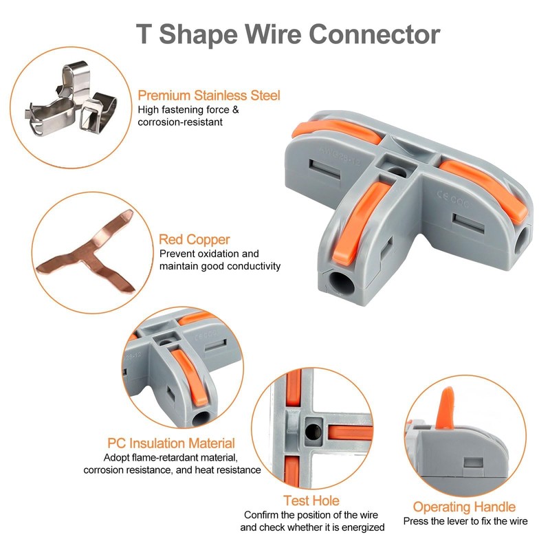 SUNJOYCO 30PCS Compact Wire Conductor Connector, T-Shape Lever Nut Wire Connectors & 1 in 2 Out Splicing Connectors, AWG 28-12