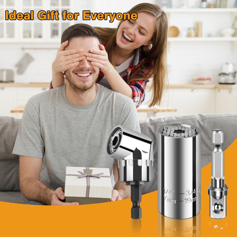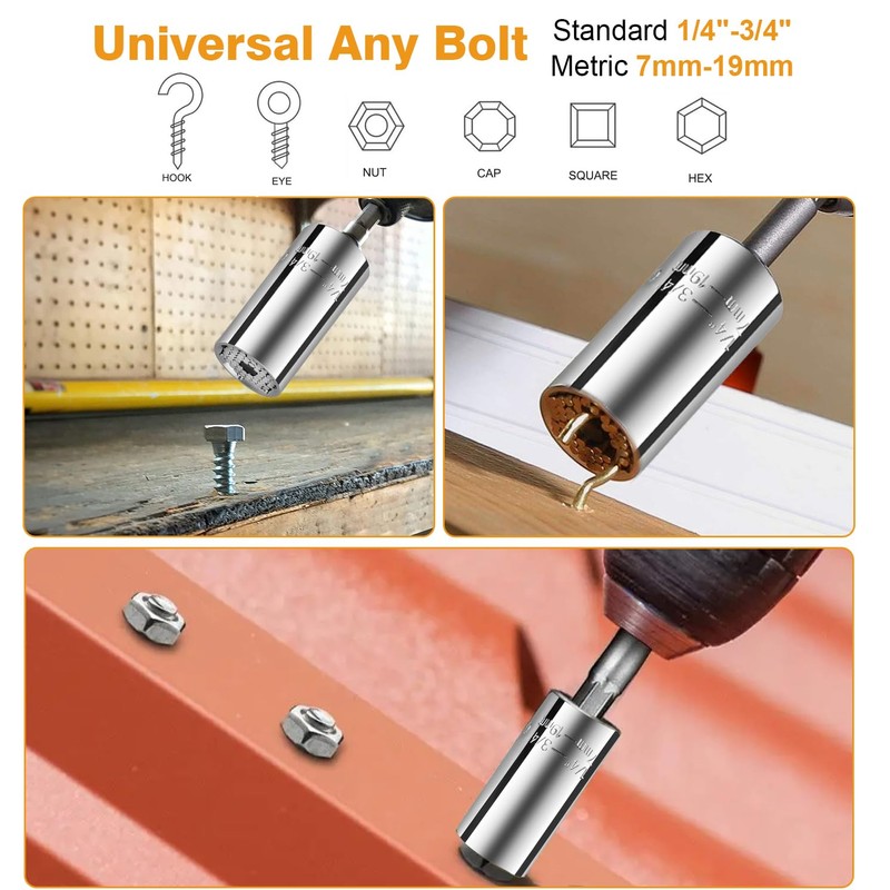 - Suitable for Metric 7–19mm: The universal socket with power drill adapter adjusts to fit standard 1/4 inch to 3/4 inch and metric 7–19mm nuts and bolt heads. Also compatible with 3/8 inch wrenches