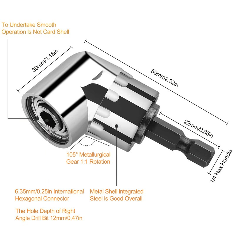 - Long-lasting: The right-angle drill attachment is made of chrome vanadium steel with high hardness. Its anti-rust, durable die-cast body and 3 ball bearings ensure long life