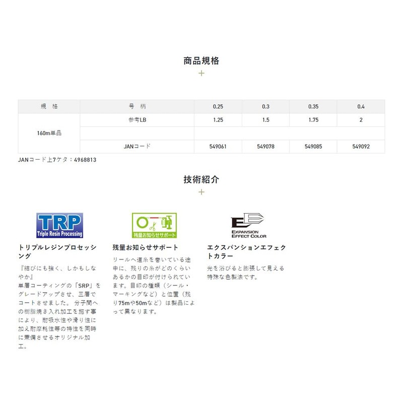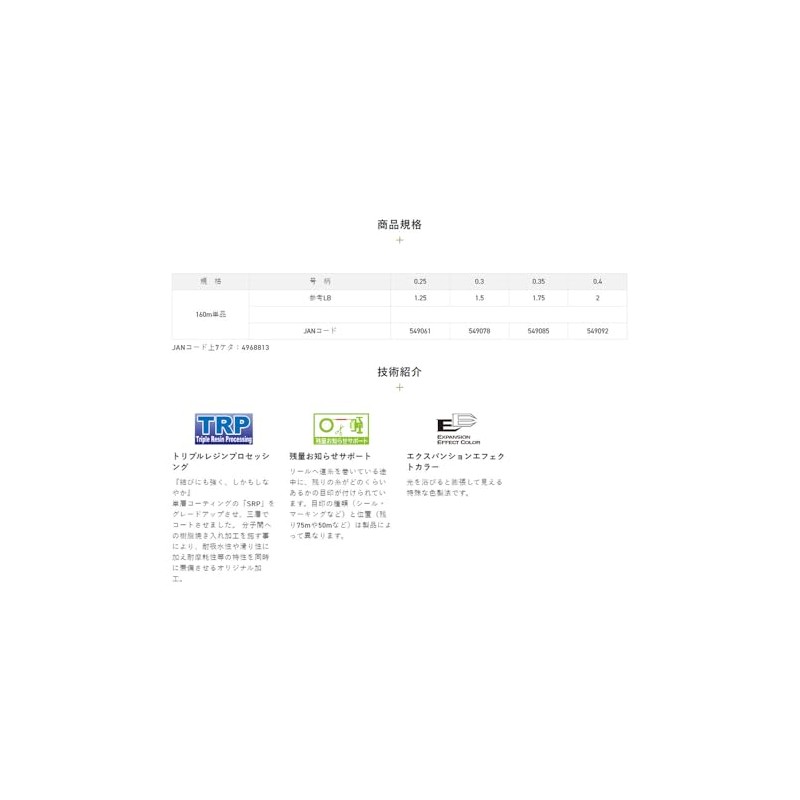 - Features: Center marking (27.6 ft (80 m) red marking), TRP (triple resin processing), 3-layer coats, with exclusive number stickers, and EXPANSION EFFECT COLOR