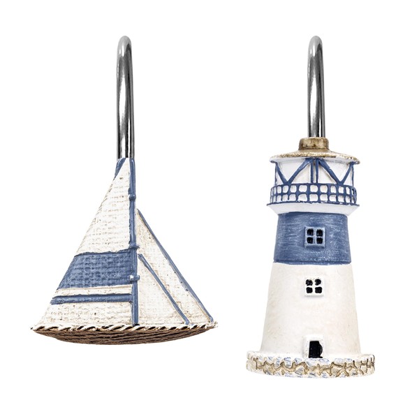 Sunlit Nautical Shower Curtain Hooks, Home Decorative Coastal Shower Curtain Rings for Bathroom, Resin, Ocean Shower Curtain Hanger Hooks for Living Room, Set of 12, Blue Lighthouse Sailboat