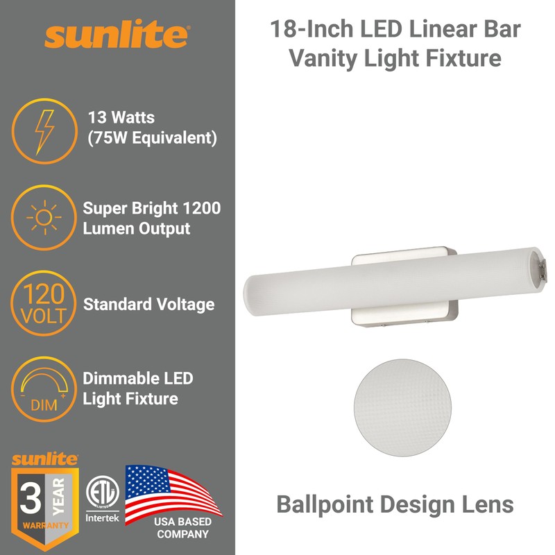 Sunlite 18-Inch LED Linear Bar Vanity Light Fixture, 13W (75W Equiv.), 1200 Lumens, 4000K Cool White, 120 Volts, Ballpoint Design Lens, Dimmable, 30,000 Hour Lifespan, ETL Listed, Brushed Nickel