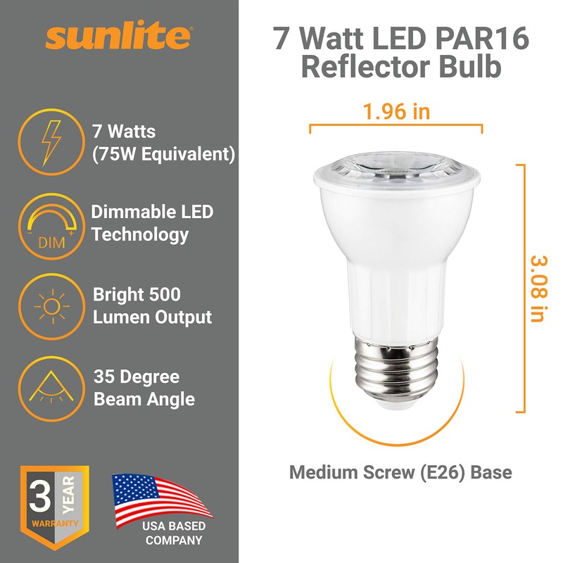 Whether you’re setting the mood in the living room or looking for lighting in your kitchen, Sunlite’s LED PAR16/MR16long neck light bulb has got your covered. Thanks to the inner reflective glass of the PAR16, it offers directional lighting which makes it perfect for track lighting, recessed lighting, desk lights, display case lighting, etc. With its dimming options, warm white light and instant brightness, the bulb will create a comfortable environment in every room of your home. Sunlite’s PAR16 bulb offers 25000 hours of lighting which is far greater when you compare it to any other lighting source. Fewer replacements means lower maintenance and substantial savings. LED bulbs use 75% less energy than an incandescent bulb and lasts 25 times longer than a traditional bulb. Sunlite features high quality light bulbs and fixtures designed to meet the needs of your home, office or workplace. We are committed to providing our customers with outstanding service, expertise and high quality products. Our LED PAR16 light bulbs are a safety choice, backed by our 3 year manufacturer warranty.