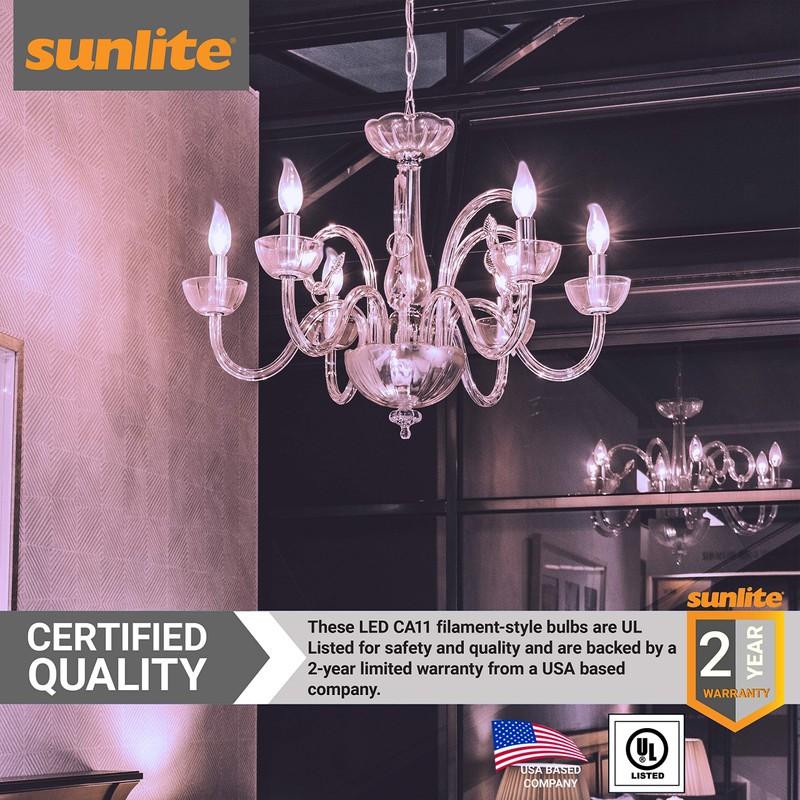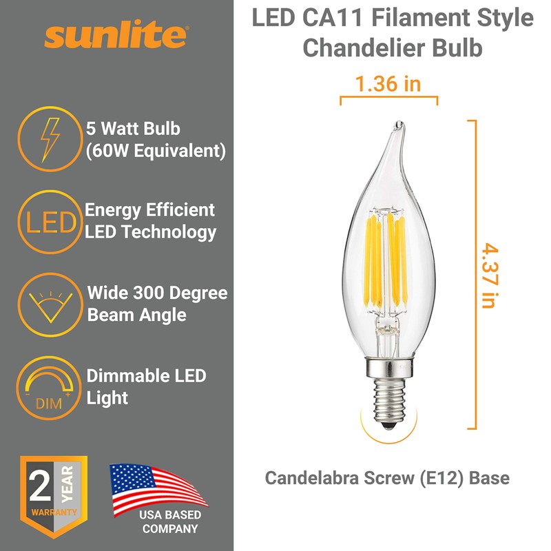 Sunlite LED Filament Style Chandelier bulbs are designed to give you up to 15,000 hours of reliable service. That means fewer replacements for difficult to reach bulbs. These dimmable and energy efficient lamps provide the same output as a 60 watt bulb while only using 5 watts of energy. With 3 hours of daily use the annual operating cost is only $0.60 per bulb. (Based on $0.11/kWh) And LED technology means they are cooler to the touch when lit and instant-on at full brightness. The standard candelabra base (E12) and classic filament style make them perfect for chandeliers, wall sconces, decorative lamps, and many other fixtures. ETL Listed for damp location installation. Ideal for both residential and commercial use.