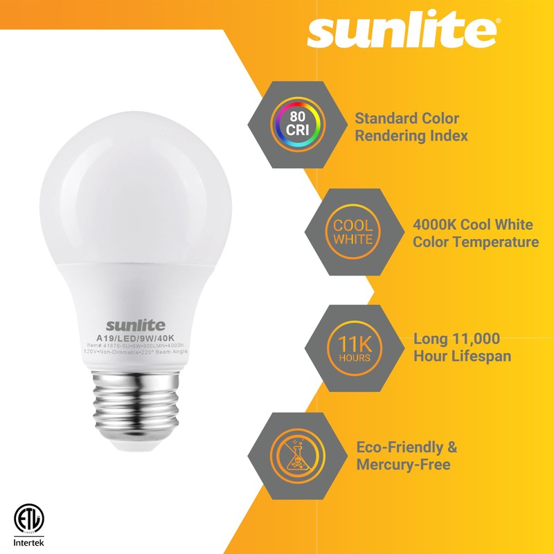 Sunlite A19 Standard LED Light Bulb, 9 Watts (60W Equivalent), 800 Lumens, Bulk 48 Pack, 120 Volts, Non-Dimmable, Medium E26 Base, RoHS, ETL Listed, 4000K Cool White
