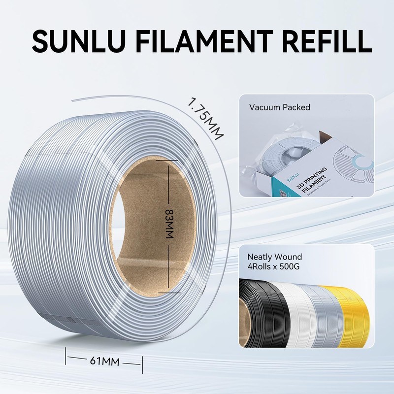 - 【SUNLU Filament Refill】4 rolls of 500g PLA plus refill, 2kg in total. Reel Hole Diameter: 82.5mm (3.22inch) Perfect for reusable filament spool and compatible with Bambu Lab AMS 3D Printer