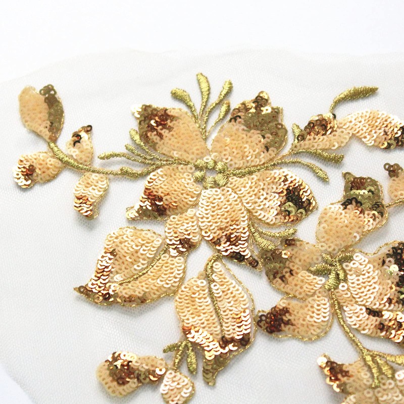 SUNMOVE Embroidery Sequin Lace Applique Sewing Flower Fabric Collar Patch for Wedding Gown Dress Bridal DIY Crafts(Gold)