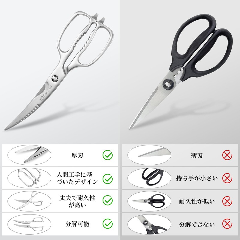 - (Rust-proof, Highly Durable) Specifications: Size: 8.9 x 2.9 x 0.3 inches (228.5 x 74 x 8 mm); Thickness: 0.2 inch (4 mm); Weight: 6.4 oz (191 g); Material: Stainless steel; Sunnecko kitchen scissors are made of high carbon stainless steel, which is long-lasting sharpness, durability, abrasion resistant, and rust resistant. High temperature heat treatment provides high toughness and is not easy to deform. The ergonomically designed handle is easy to hold, and will not hurt your hands even when you squeeze it, and you can use it for a long time