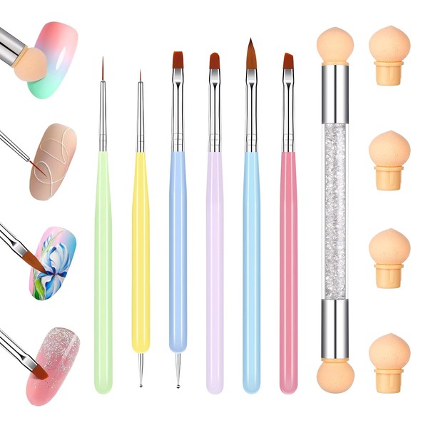 SUNNIFLY 7 Stück Pinsel für Gelnägel,6 Pinsel aus Weicher Faser + 1 Schattierungsschwamm + 4 Ersatzteile, Geeignet für DIY-Nageldesign, Werkzeug zum Zeichnen von Details auf den Nägeln