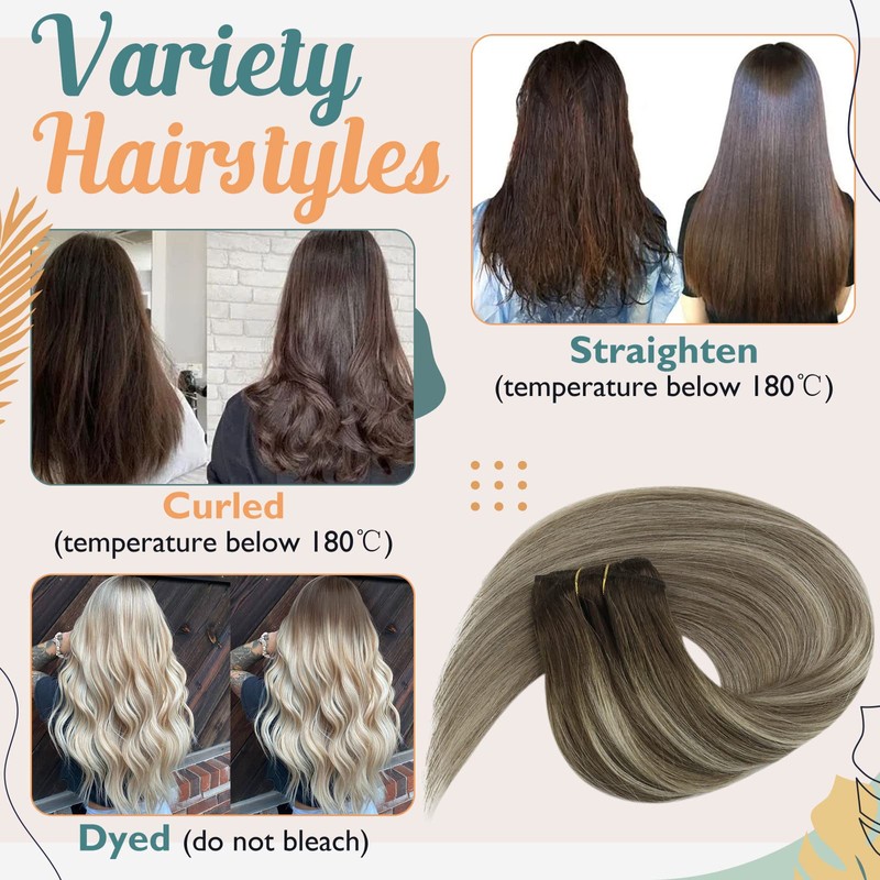 - ♥Various Style ♥ VeSunny balayage human hair extensions clip ins can be straightened, curled, washed and restyled as you like. Please notice that the temperature should be under 180℃. It can also be used in combination with other categories to meet the needs of various styles for hair volume.