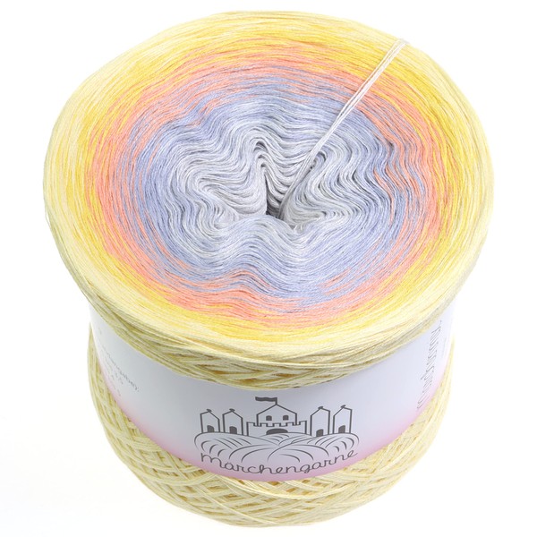 Colour gradient yarn - Sunny. 4 ply. Material: 50% cotton and 50% polyacrylic. Colour: vanilla, gold, quartz, steel, light grey. This bobbel is as shown in the picture. The medium colours are never quite a plain colour. Pendant varies subject to availability. You can process the yarns from the inside or outside. The individual threads lie next to each other and are not twisted. The colours are connected with mini nodules. Only one thread changes at a time, so that the transition is smooth and a harmonious colour gradient is given. Needle size: approx. 3-6. 100 g = 380 m.