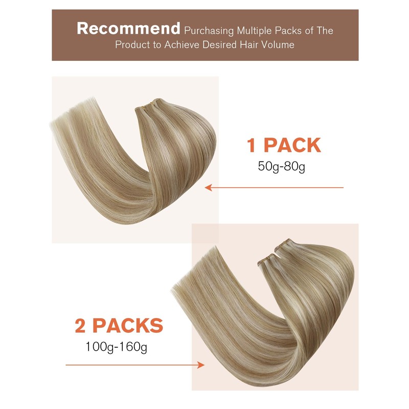 - 1. Specifications: Sunny Hair Genius Weft Extensions are available in sizes: 14-16 inches (50g), 18 inches (60g), 20 inches (70g), and 22-24 inches (80g). For optimal natural-looking results, 2-3 packs are recommended.