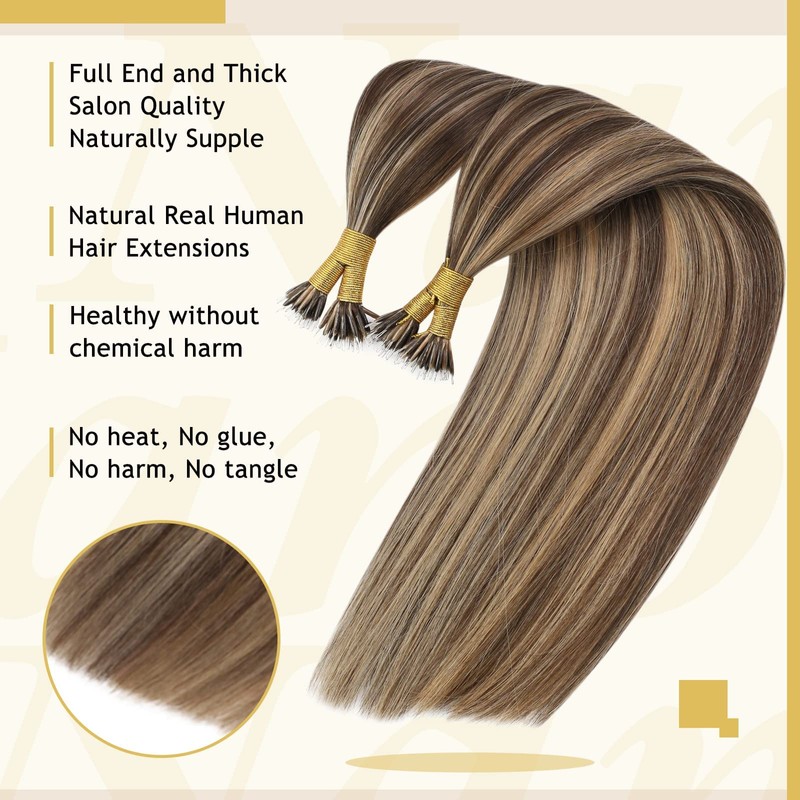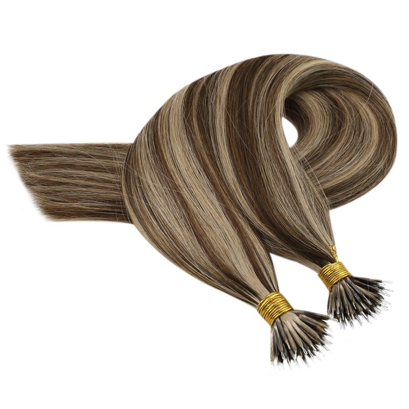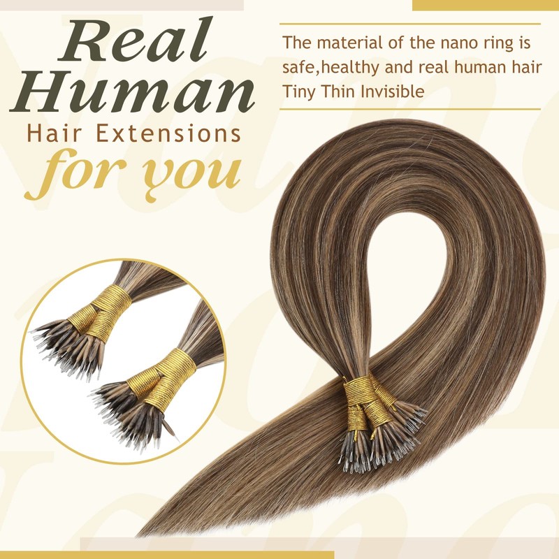 Sunny Hair Nano Beads Hair Extensions Invisible Nano Hair Extensions Human Hair Straight Nano Tip Hair Nano Ring Hair Extensions 50G/50S Medium Brown Highlighted Strawberry Blonde 14inch