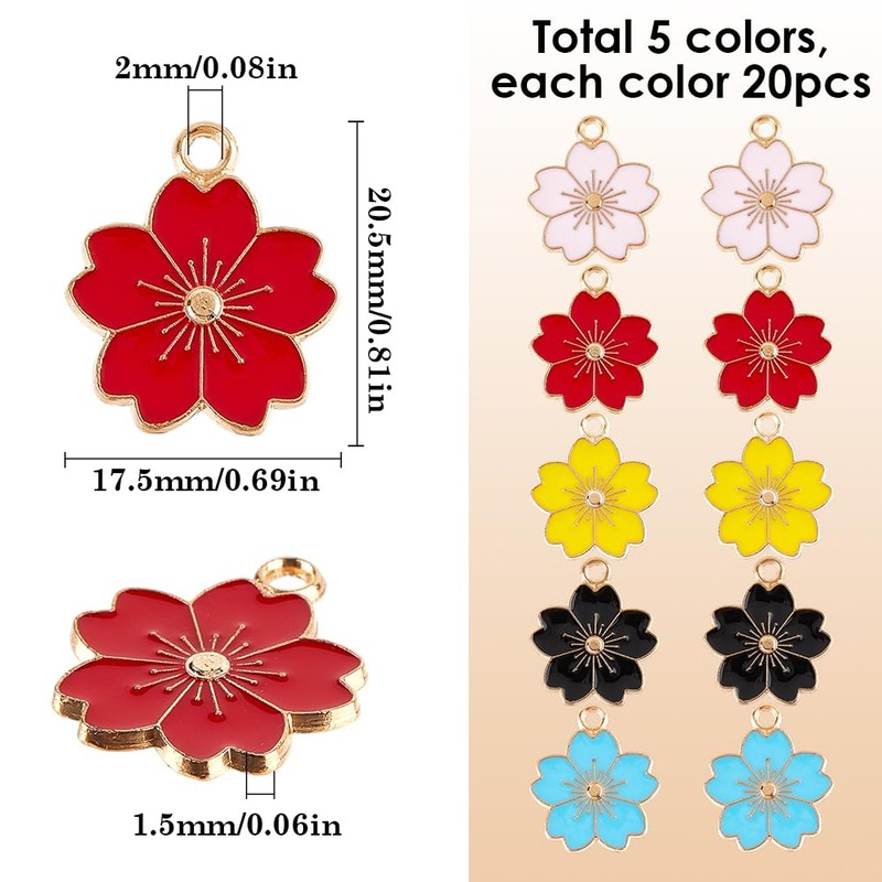 SUNNYCLUE 1 Box 100 Pieces 5 Colours Japanese Cherry Blossom Pendant Small Flower Pendant Enamel Flat Pink Red Spring Small Flower Pendant for Jewellery Making Pendant Earrings Wedding Urla, enamel