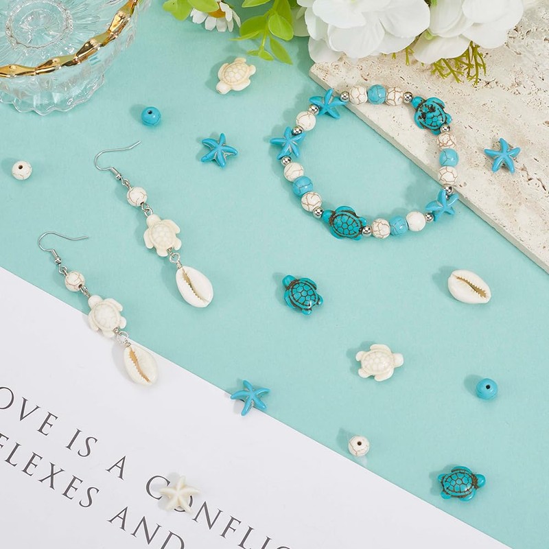 - Ocean bead kit: Get creative with 200 beads featuring 4 styles (turtle beads, starfish beads, shell beads and round stone beads) ideal ocean designs. Make bracelets, necklaces, or keychains, enough variety to craft marine jewellery summer