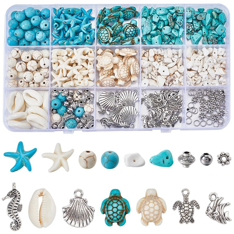 - High Quantity Meterial: Sea turtle beads, starfish beads and round stone beads are made of synthetic howlite or synthetic turquoise, chip beads are made of synthetic turquoise or magnesite, shell cabochons are made of acrylic, round spacer beads and open jump rings are made of stainelss steel, bicone spacer beads, flower spacer beads and ocean charms are made of alloy