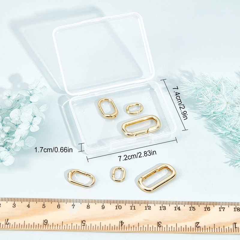 - 0.51in/0.8in/1.15in: Brass oval rings are in 3 styles, each style 2pcs, The Smallest: 13x10x2mm(0.51x0.4x0.08inch), inner diameter: 9x5.5mm(0.35x0.22inch). The Medium: 20x15x2.6mm(0.79x0.6x0.1inch). The Largest: 29x14.5x3.5mm(1.14x0.57x0.14inch), inner diameter: 9x23mm(0.35x0.9inch), plastic bead containers: 1pc