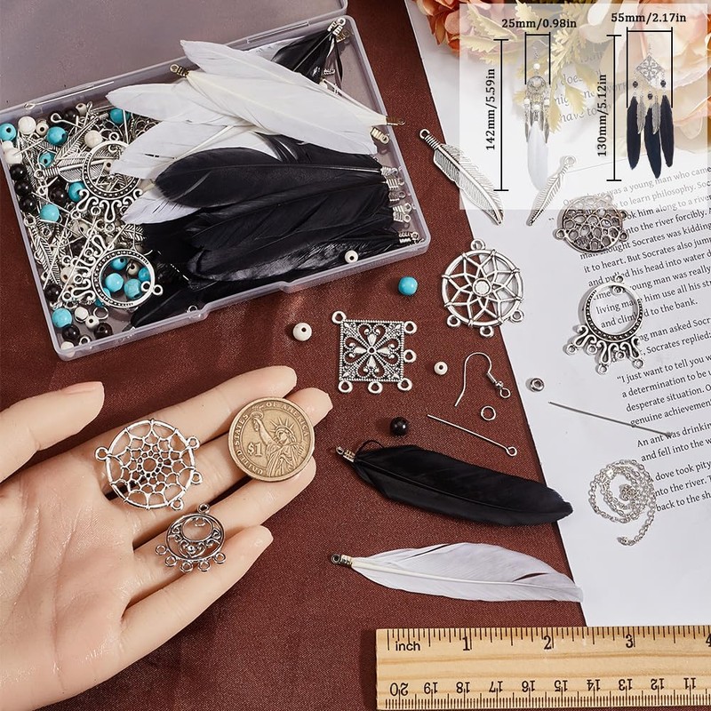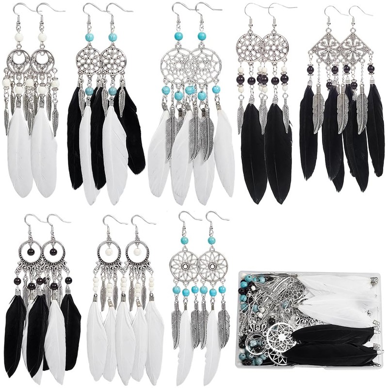 SUNNYCLUE 1 Box 8 Pairs Earrings Making Kit feathers Charm Bulk Bohemian White Black feathers Charms Earring Chandelier Charms Bohemian Charms for Jewellery Making Kits Adults Women Gifts Supplies