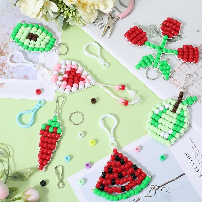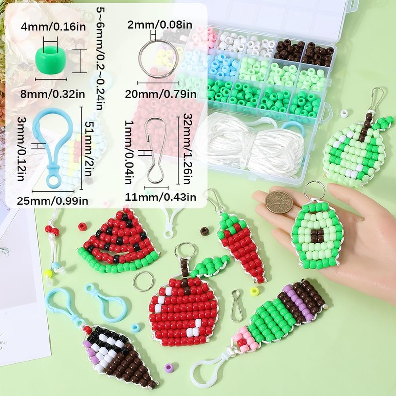 - [FOOD THEMED PONY BEADS KIT]: The pony beads keychain making kit is themed in food. You can make multiple style food themed keychains such as red cherry keychain, chilli keychain, watermelon keychain, ice cream keychain etc using the beading kit.