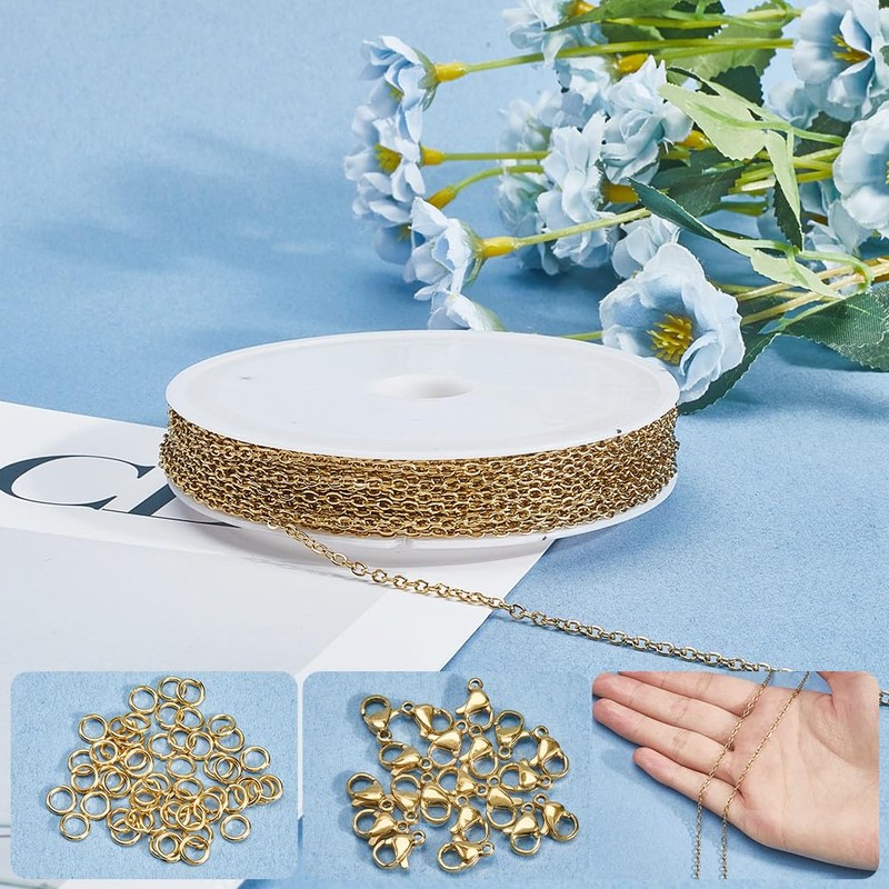 - Easy to Use: The chain link jewellery making kit is equipped with jump rings and lobster clasps. You can cut the appropriate length according to different sizes, hang different beads, pendants, etc., connect the jewellery chain and lobster clasp with the jump ring, finally fasten the chain with lobster clasp
