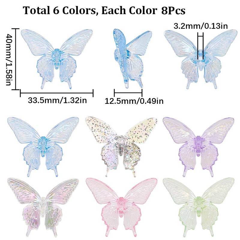 - LARGE SIZE ACYLIC BUTTERFLY CHARMS:Acrylic butterfly charms are in 6 colors, each color 8pcs, in total of 48pcs. Acrylic butterfly charms: 40x33.5x12.5mm(1.58x1.32x0.48inch), hole: 3.2mm, plastic bead containers: 1pc.