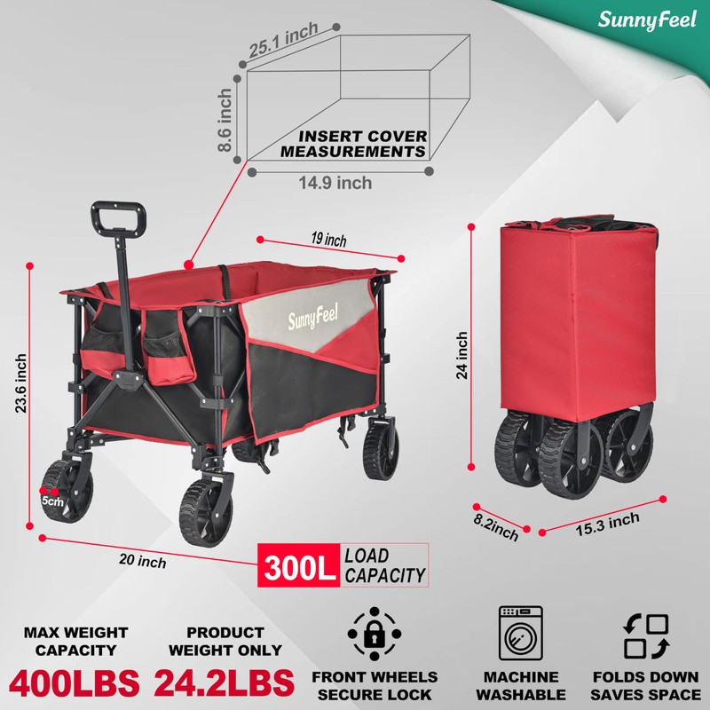 SunnyFeel Heavy Duty Collapsible Outdoor Utility Wagon Cart 300LB Capacity Adjustable Handlebar,Foldable Beach Wheels Stable Durable Oxford Fabric for Shopping Garden Camping (Black & Red)