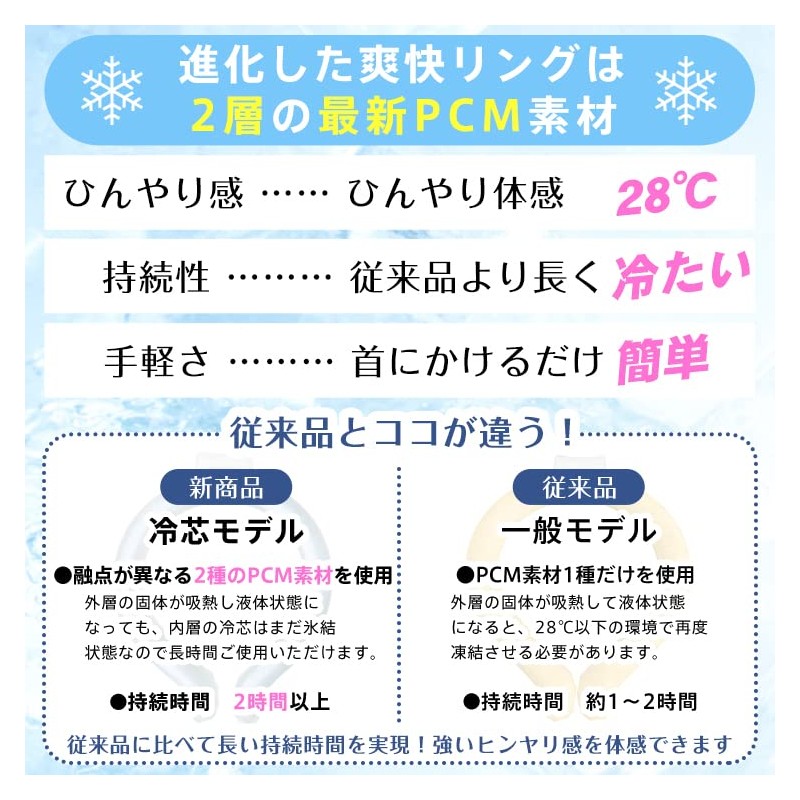 - (Advancement point of this year) The 2-layer construction ensures that you stay cool even when it starts to melt. Because it uses two types of PCM materials with different melting points, even if the outer layer becomes hot and liquid, the inner layer has a cold core is frozen, so it can be used for a long time than conventional products