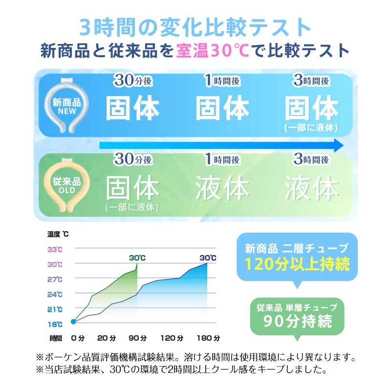 - (Advancement point of this year) The 2-layer construction ensures that you stay cool even when it starts to melt. Because it uses two types of PCM materials with different melting points, even if the outer layer becomes hot and liquid, the inner layer has a cold core is frozen, so it can be used for a long time than conventional products