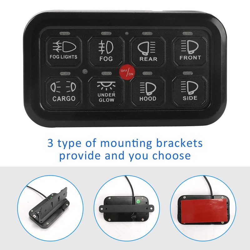 - 【Easy Installation and Safety Design】— The 8 gang switch panel was the perfect no-frills solution that cleaned up your engine bay,it makes all the wire organize. With reverse polarity protection,overload protection, thermal protection, independent 60A circuit breaker,to ensure the safe operation of LED lights and other accessories.There are two installation methods. It comes with mounting brackets or used double sided tape to hold it on.