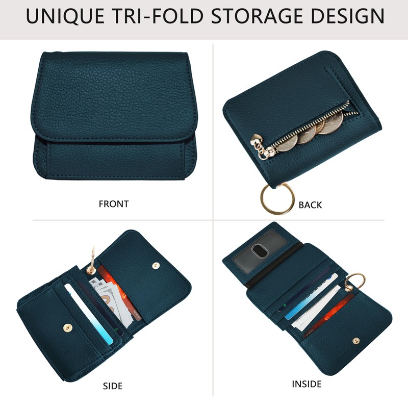 - UNIQUE TRI-FOLD STORAGE DESIGN:Indulge in elegance with our card holder wallet.Featuring 6 card slots,1 ID window,1 cash pocket,1 side zipper coin pocket, and a stylish keychain wristlet with a leather tassel. The unique fold design ensures card security while keeping things sleek. Say goodbye to bulky wallets—this compact organizer effortlessly stores your essentials with flair.
