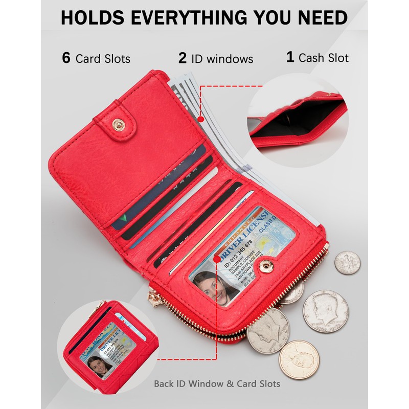 - COMPACT BUT SPACIOUS This small ladies wallet offers 6 extended card slots, 2 clear ID windows, 1 bill compartment as well as a 270° all around zipper coin pocket for easy access. The front window allows quick ID display - no more annoying searching! All in a slim, space-saving design.