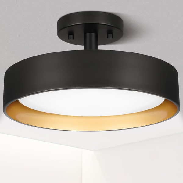 SunRider Semi Flush Mount Ceiling Lights, 12 Inch 25W LED Ceiling Light Fixture Black for Hallway Kitchen, Gold Inside, 5000K Daylight White, Dimmable
