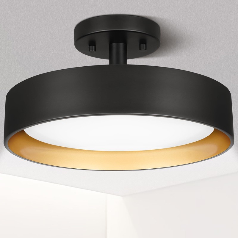 - Modern Minimalism Design & Wide Applications: The modern mid-century LED ceiling light fixture features a matte black metal exterior lampshade with a champagne gold interior, and is combined with an LED panel light source. A vintage and classical look adds an antique and retro vibe to your cozy space. 12-inch diameter dimmable LED flush mount ceiling light is compatible with most household and commercial areas, and which ideal for hallways, bathrooms, kitchens, closets, stairwells, bedrooms, living rooms, corridors, entrances, porches, mud rooms, children's rooms, dining rooms, bars, cafes, offices, hotels, and restaurants.