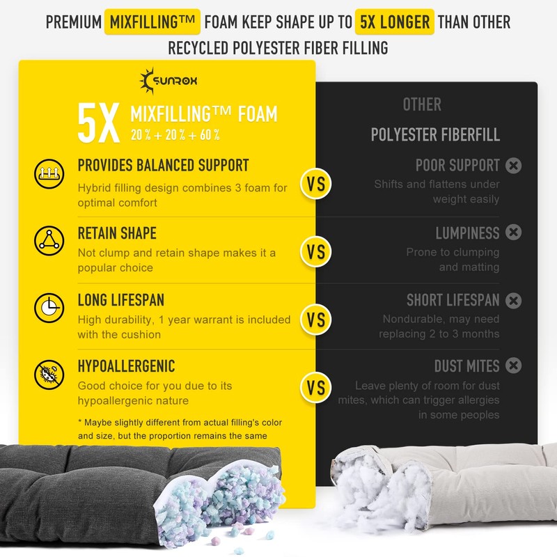 - 【Premium MIXFILLING Foam Technology】Bench cushion filled high-quality gel memory foam, premium responsive memory and high-density foam, Unique MIXFILLING technology, to help retain shape and maintain long-lasting, comfort and support, bench pads keep shape up to 5x longer than other recycled polyester fiber filling. Add the soft siliconized polyester non woven wrap layer inside cushion cover, provides extra plushness and loft, gives it a luxuriously full look.